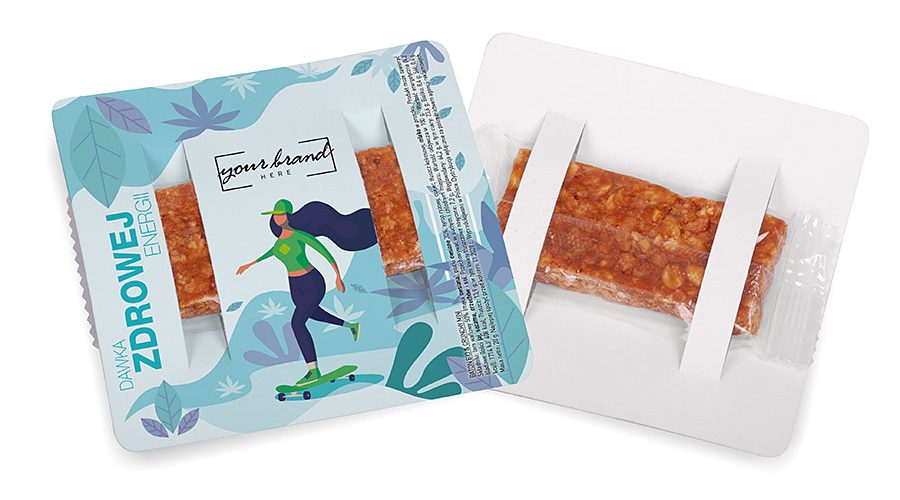• spelt bar in a transparent flow-pack packaging with a cardboard blank