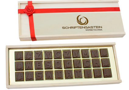 Čokoládová tabulka s písmeny v reklamní krabičce